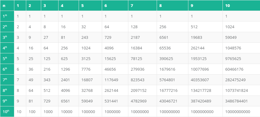 В таблице степеней содержатся значения натуральных положительных чисел от 1 до 10.